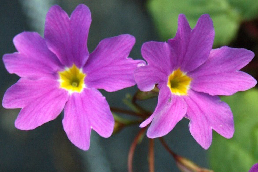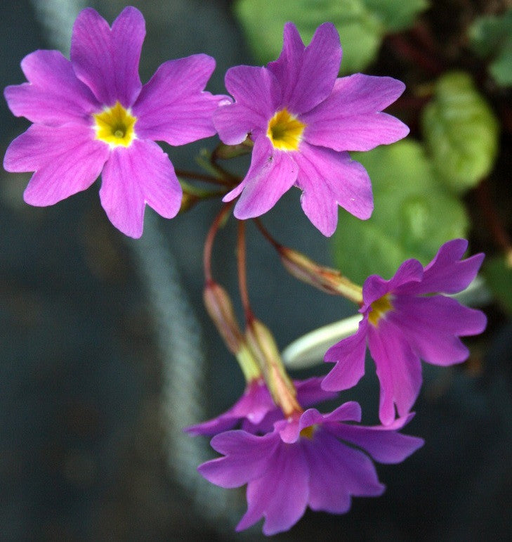 Primula 'John Fielding' has magenta-pink flowers from red-flushed calyces on long red-flushed pedicels flowering in late winter and spring. This rare early flowering primrose is a cross between the well known P.wanda and a Turkish species - P megasifolia.