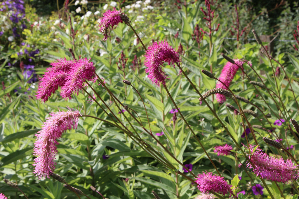 Sanguisorba obtusa is described by Val Bourne as “a glaucous-leaved Japanese species that arrived in 1860, has the finest foliage of all. Each round grey-green leaf has an attractive matt bloom, enhanced by a finely edged rim of deep pink. The fluffy, rather squat flowers on this 4ft high plant are a strong rose pink and they bend over slightly as they mature. Flowering begins in July and continues until late August.” Well said Val. Although I'd add that ours flowers much longer and doesn't grow much higher than 3 or 3.5 feet. Probably depends on sunlight and how packed the plant is.